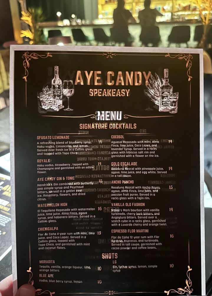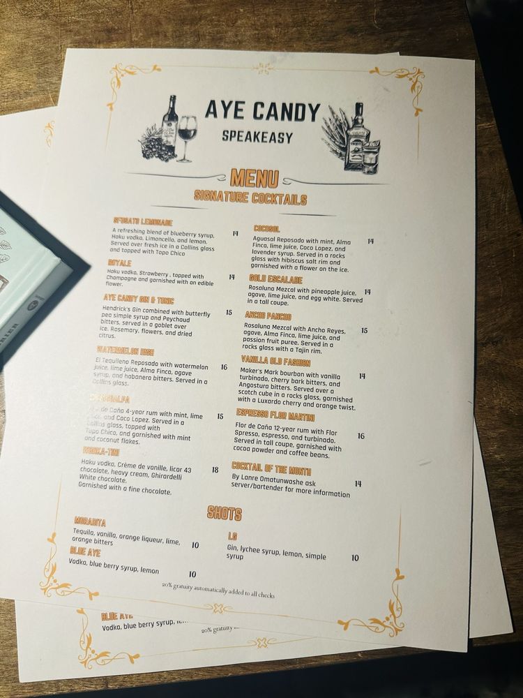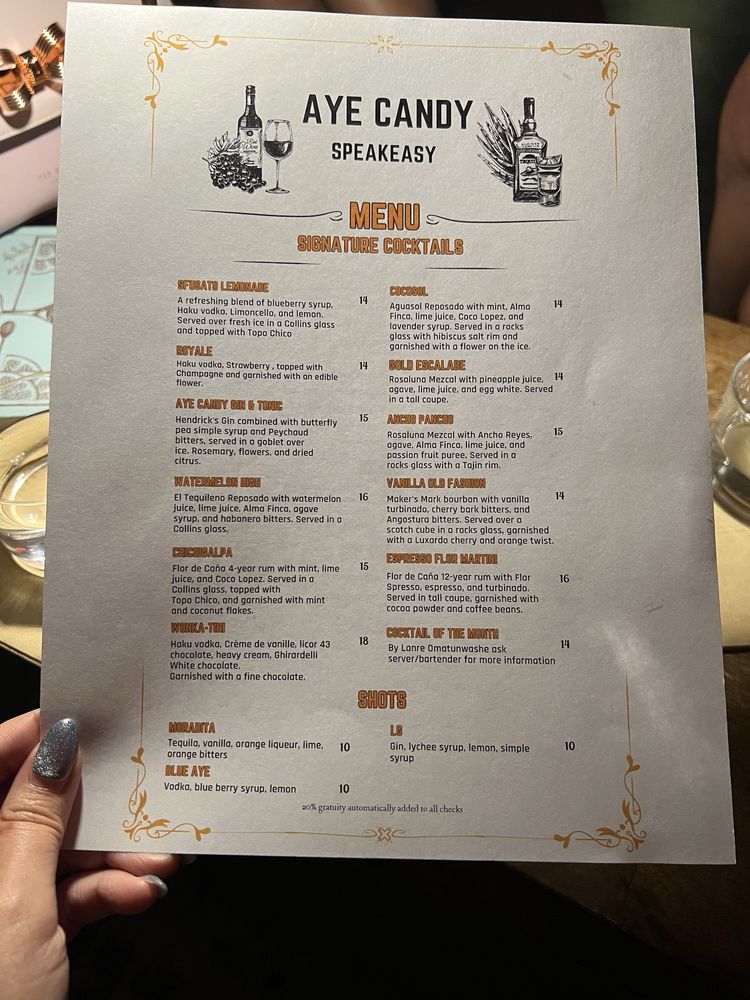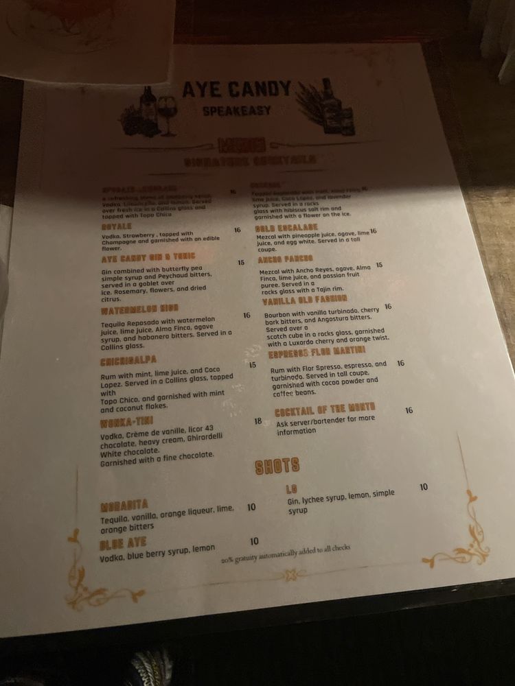 Introducing the menu at Aye Candy, a classy cocktail bar located in Houston, TX. This establishment offers signature cocktails like the Ancho Pancho, AYE CANDY GIN & TONIC, and CHICHIGALPA, as well as a selection of wines and shots. Customers have praised the attentive bartenders, amazing cocktails, and overall ambiance, making it a perfect date spot. The decor is beautiful, with comfortable seating for couples and groups. The menu features creatively crafted drinks like the Gold Escalade and Cocosol, both highly recommended by patrons. With valet parking, ADA-compliant entrance, and a pool table, Aye Candy provides a unique and enjoyable experience. Don't miss out on the opportunity to visit this delightful speakeasy for a fun and relaxing evening.